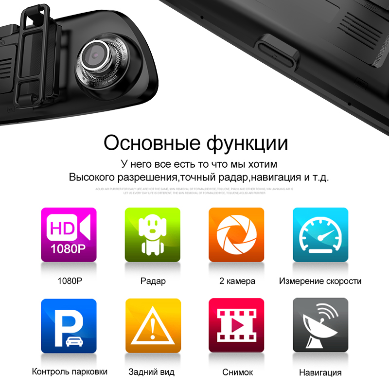 Сочетание видеорегистратора с двумя камерами и видеопарктроника (камера заднего вида может работать в режиме парковки), 7 дюймовый монитор расположен посередине зеркала, навигатор с возможностью обновления пробок через WiFi, FM-трансмиттер, просмотр видео с воспроизведением звука через магнитолу, просмотр фото, Android 6.0, зеркало со специальным антибликовым покрытием, крепится на штатное зеркало. Датчик движения, G-sensor. Приложение PlayMarket позволяет установить такие программы, как Yandex Навигатор, Антирадар.